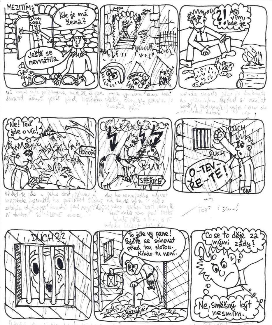 Před asi 25ti lety jsme chtěli na Humpolákovi publikovat sadu komiksů podle pověstí paní Pamětnické. Nakonec tento nápad skončil neumělými skicami několika okének ke dvěma pověstem. Pro pobavení přikládáme výběr k pověsti o Jiřické lípě. Autor je Olaf. Schválně, jestli poznáte, k jakým částem textu by se konkrétní obrázky hodily 😊
