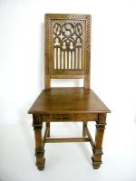 zásuvková skříňka a bohatě vyřezávaná židle.