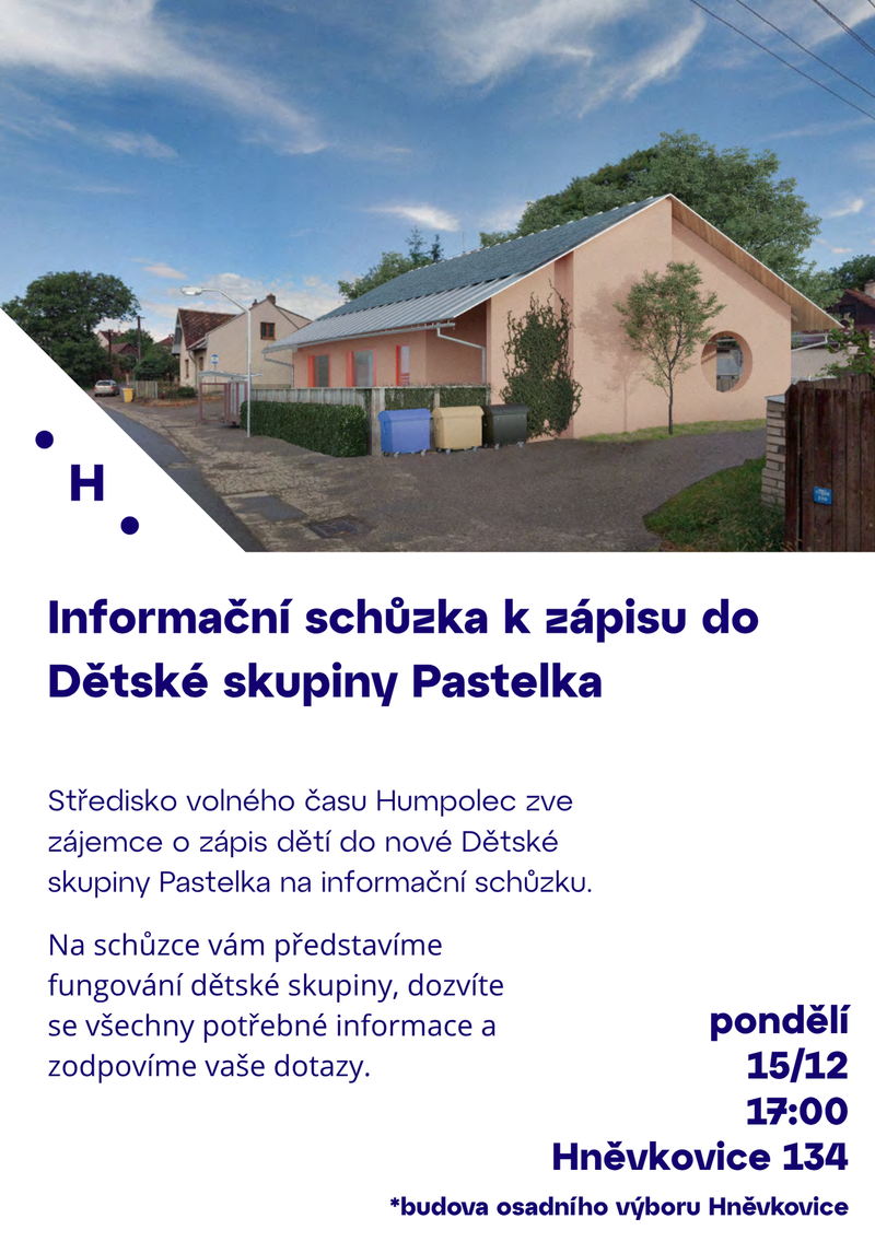 V pondělí 15. prosince se od sedmnácti hodin v budově osadního výboru v Hněvkovicích uskuteční informační schůzka pro rodiče zvažující zápis dětí do dětské skupiny. Na schůzce se rodiče dozvědí všechny potřebné informace a odpovědi na dotazy.