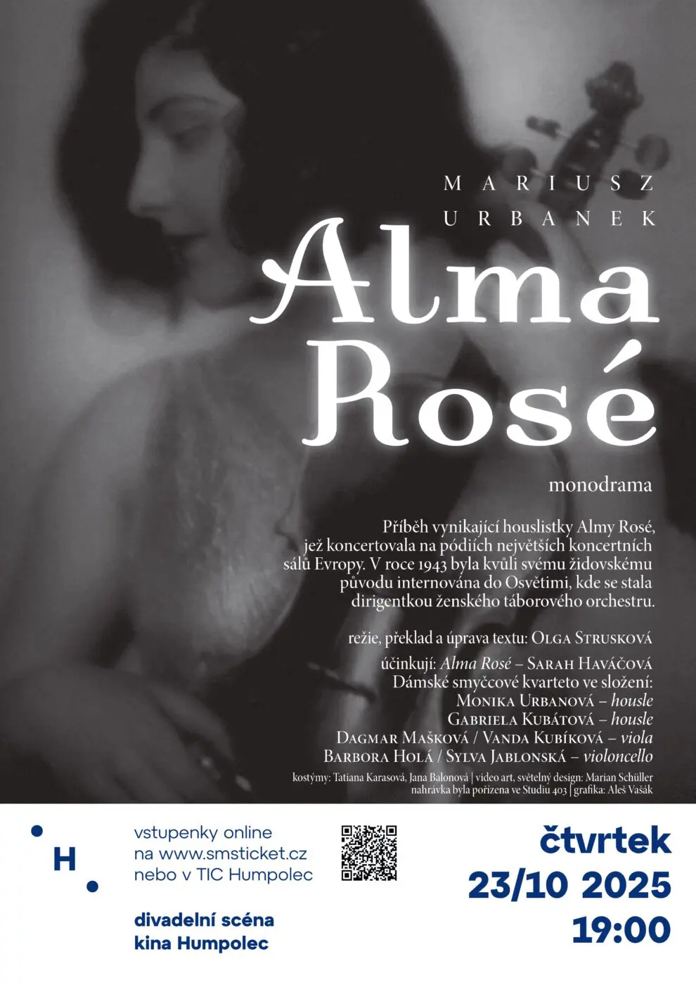 Večer si nenechte ujít monodrama Alma Rosé. Příběh vynikající houslistky, neteře skladatele Gustava Mahlera Almy Rosé, jež koncertovala na pódiích největších koncertních sálů Evropy. V roce 1943 byla kvůli svému židovskému původu internována do Osvětimi, kde se stala dirigentkou ženského táborového orchestru.