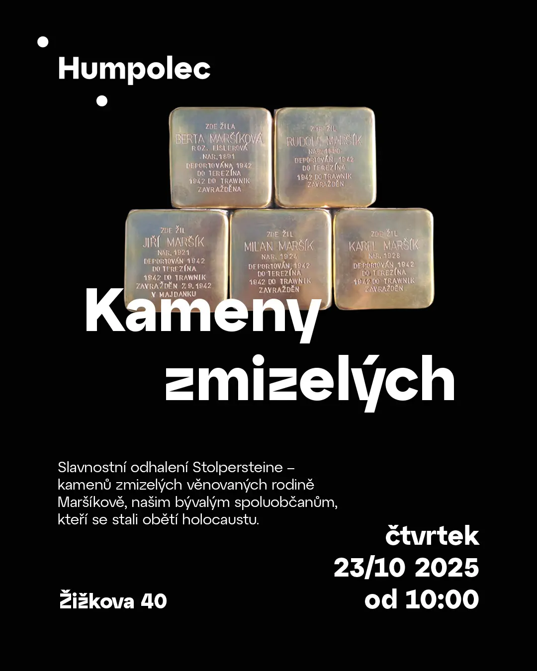 Zveme vás na slavnostní odhalení Stolpersteine – kamenů zmizelých věnovaných rodině Maršíkově, našim bývalým spoluobčanům, kteří se stali obětí holocaustu.