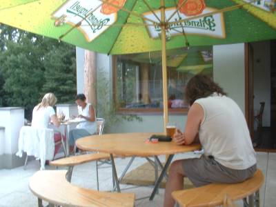 teplo a tak jsme se usadili na zahrádce, odkud máte výhled přímo na koupaliště
