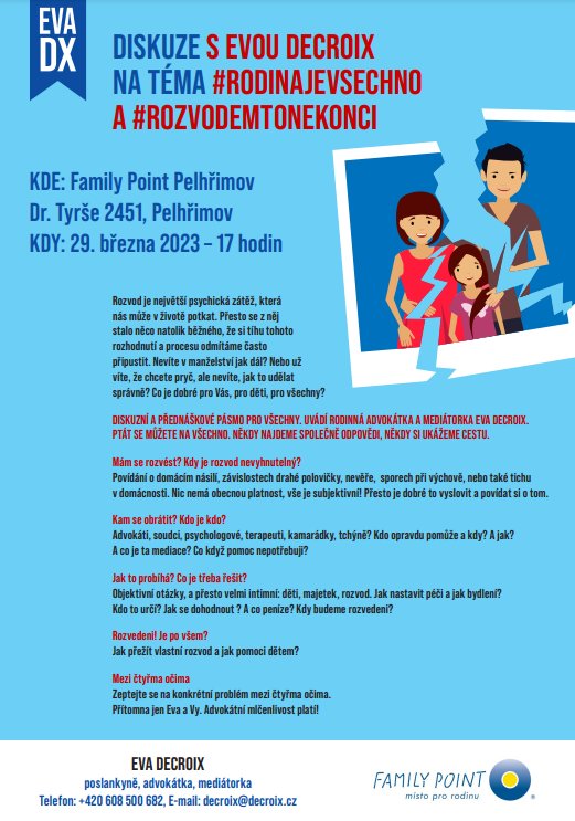 Už v březnu jsme vzdělávací nabídku odstartovali přednáškou s motivační koučkou Lenkou Šlapákovou na téma „Práce a rodina v balancu“ a terapeutkou Mgr. Ivou Babincovou o Rodině jako (ne)fungujícím systému. Ve středu 29. března od 17 hodin povede diskuzi ve Family Point Pelhřimov „Rozvodem to nekončí“ poslankyně Eva Decroix, která se rodinném právu roky věnuje jako advokátka a mediátorka. Akce je spojená nejen s edukační činností, ale i s možností individuální právní bezplatné konzultace.