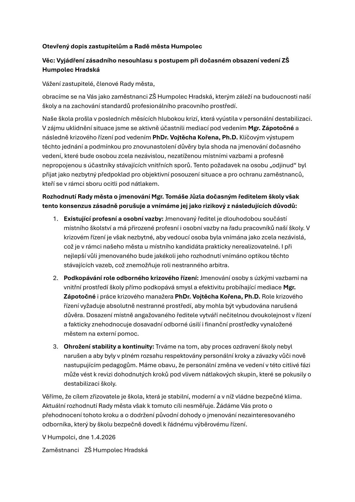 po zveřejnění článku se na FB Humpolec objevil ještě jeden text, týkající se situace. Dopis není podepsán a v diskusi pod ním anonymní autor uvádí, že bude v pondělí 7.4. doručen zřizovateli s doplněním příslušných jmen.