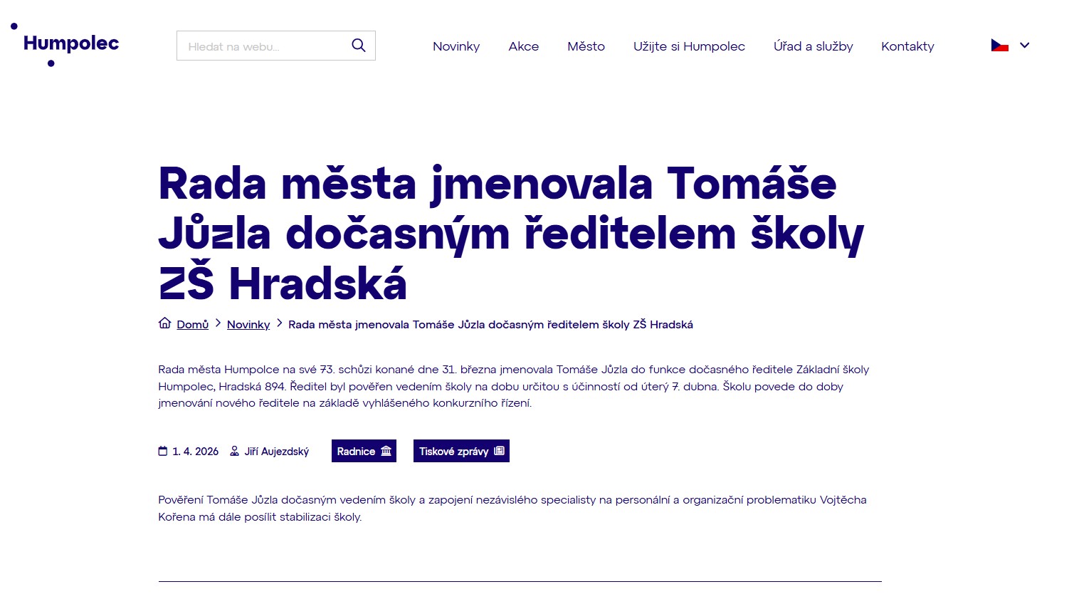 Rada města Humpolce na své 73. schůzi konané dne 31. března jmenovala Tomáše Jůzla do funkce dočasného ředitele Základní školy Humpolec, Hradská 894. Připojujeme i vyjádření radních města za HUMPOLECGO! a Piráty ke jmenování dočasného ředitele ZŠ Hradská. edit: doplněn Otevřený dopis Zřizovateli od zaměstnanců školy