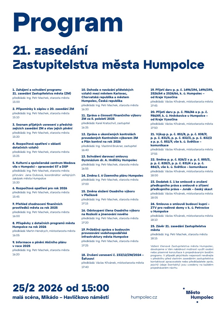 Dovolujeme si vás pozvat na 21. zasedání Zastupitelstva města Humpolce, které se uskuteční ve středu 25. února od 15 hodin v Mikádu. Na programu bude například přehled zhodnocení finančních prostředků města za rok 2025, příspěvky z dotačních programů města, informace o plnění Akčního plánu v roce 2025, zpráva kontrolního výboru a také průběžná zpráva o budoucím provozování vodohospodářské infrastruktury.