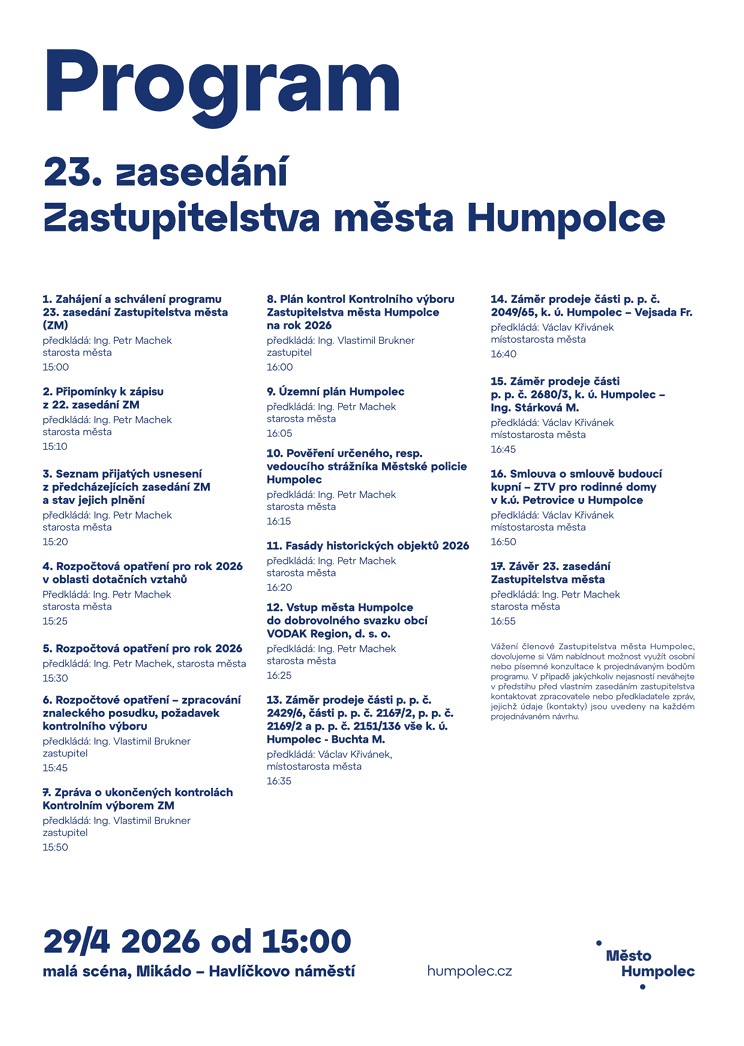 Dovolujeme si vás pozvat na 23. zasedání Zastupitelstva města Humpolce, které se uskuteční ve středu 29. dubna od 15 hodin v centru Mikádo. Na programu budou například rozpočtová opatření pro rok 2026, územní plán Humpolce nebo vstup města do dobrovolného svazku obcí VODAK Region, d. s. o.
