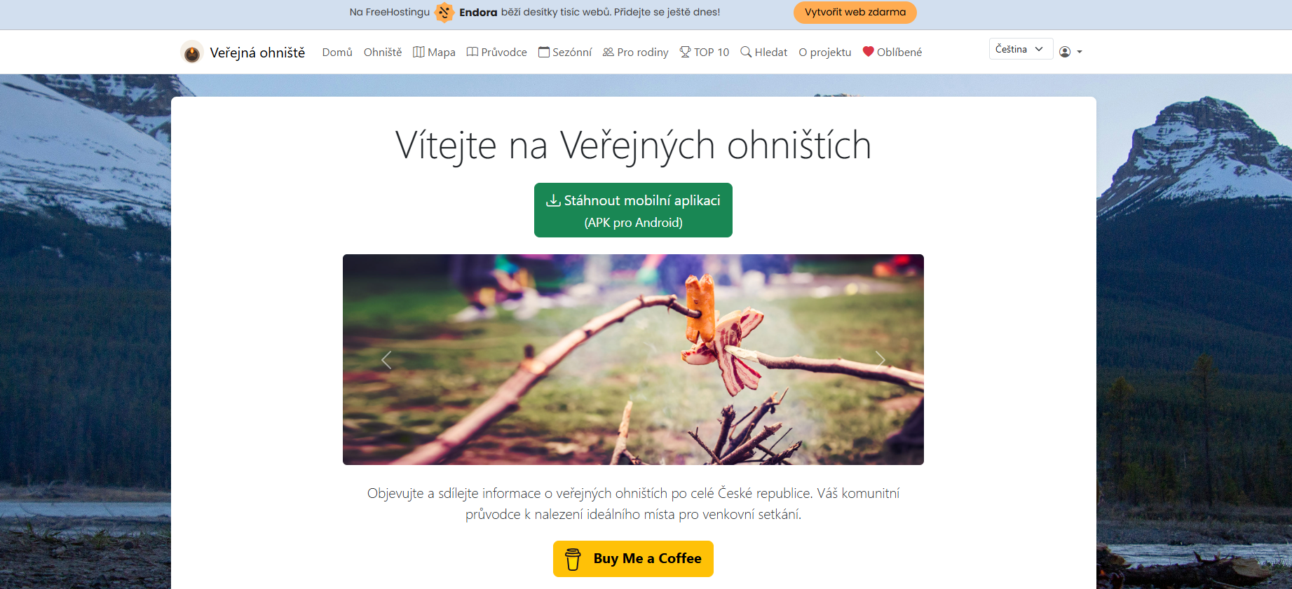 Na stránce najdete přehled venkovních lokalit (ohnišť) a můžete se snadno prokliknout na detail místa. Tam obvykle najdete popis, informace o dostupnosti a vybavení, případně i GPS polohu. Web je navržený tak, aby odpověď na otázku „Kam dnes?“ byla co nejrychlejší.