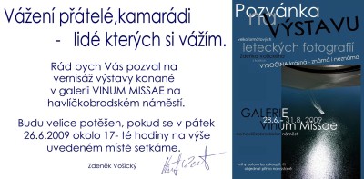 Dovoluji si vás pozvat na výstavu velkoplošných leteckých fotografií Zdeňka Vošického z kolekce „Vysočina krásná – známá i neznámá“. Výstava se koná v období od 28.června do 31.srpna 2009 v galerii VINUM MISSAE na havlíčkobrodském náměstí.